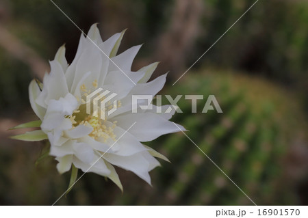 白い花びらの金盛丸というサボテンの花のアップの風景