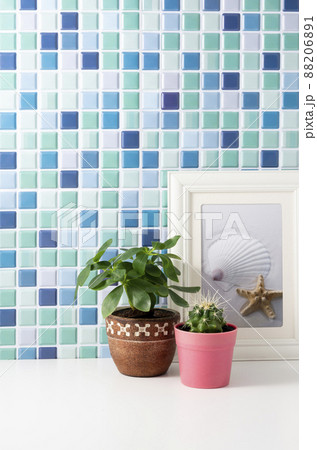 フォトフレームとタイル壁と観葉植物