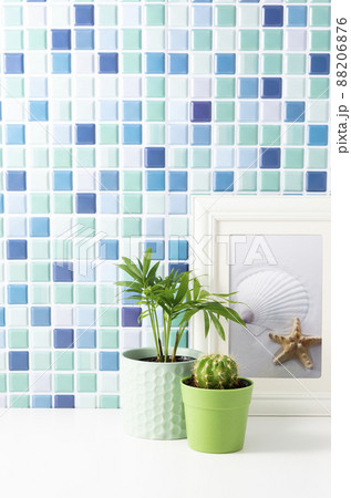 ブルーのタイルと観葉植物