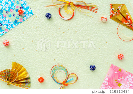 白に金銀箔の和紙に赤い水引と梅の背景素材