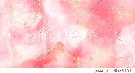 Pink blush liquid watercolor background with golden lines, dots and stains. Pastel marble alcohol ink drawing effect. Vector illustration design template for wedding invitation