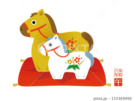 干支の馬と正月モチーフの年賀状イラスト(赤×金)