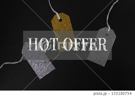 Colorful glitter tags with text overlay promoting special offers on a dark background