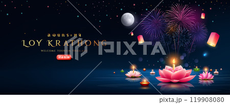 Loy krathong thailand festival, pink lotus flowers, colorful fireworks lighting at night