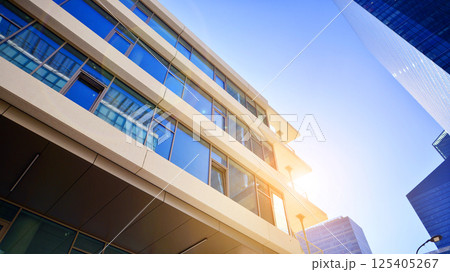 Downtown corporate business district architecture. Glass reflective office buildings against blue sky and sun light. Economy, finances, business activity concept. Rising sun on the horizon.
