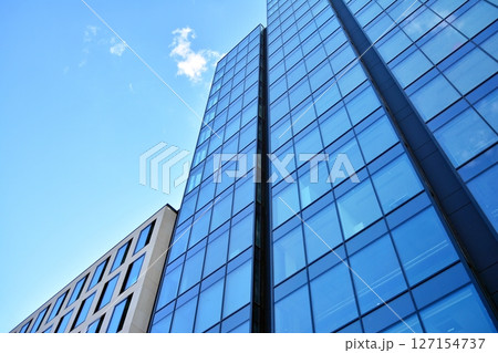 Modern sustainable glass office buildings. Exterior view of corporate headquarters glass buildings architecture.Glass windows in energy-efficient buildings. Financial business center buildings.