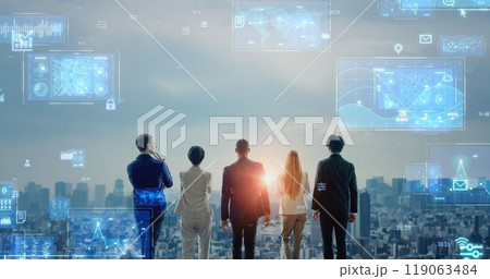 都市を眺める多国籍の人々とビジネス戦略