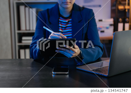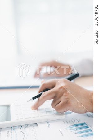 Concept of financial planning and accounting. A businesswoman uses a calculator to analyze reports and charts, calculating budget and investment strategy with focus and precision at office desk.