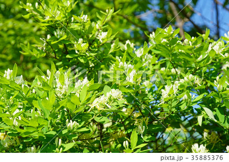 自然 植物 キンギンボク、花の色が白から黄色に変化。同じ枝で二色の花を楽しめます