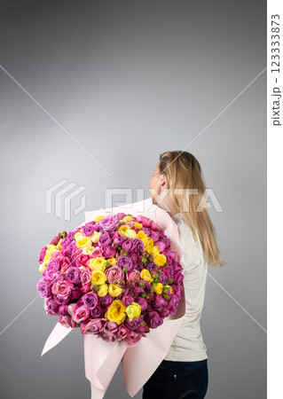on light gray background a young blonde girl with a large bouquet of pink peony roses women's holiday March 8 first date the girl stands with her back turned away