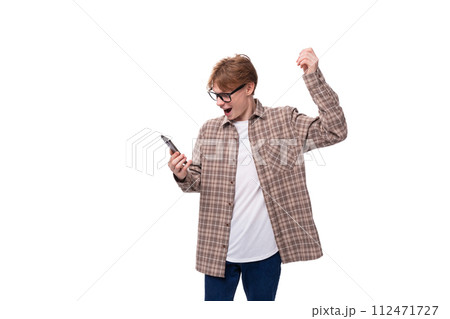 young handsome red-haired guy in a plaid shirt joyfully looks at the phone