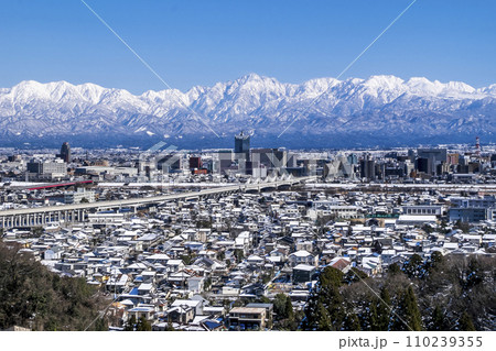 富山市全景のパノラマ立山連峰立山あおぐ特等席呉羽山展望台から毛勝山、剱岳、立山連邦富山市街地の雪景色