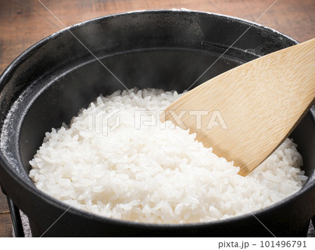 お釜で一合のお米を炊いた様子を黒背景で撮影
