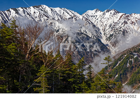 北アルプス・冷池付近から見る残雪の蓮華岳と針ノ木岳