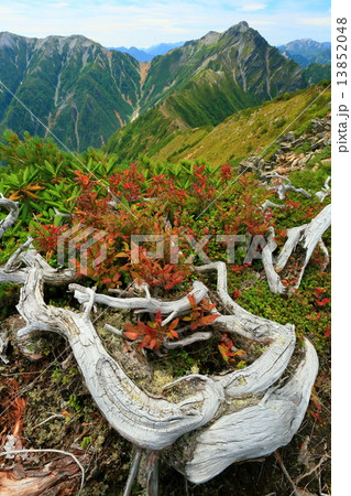 北アルプス 赤沢岳山頂の枯れハイマツと針ノ木岳方面