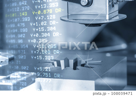 Abstract scene the wire EDM machine cutting the mold insert parts and G-code data background.