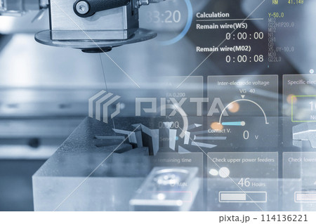 Abstract scene the wire EDM machine cutting the mold parts and graphic data background.
