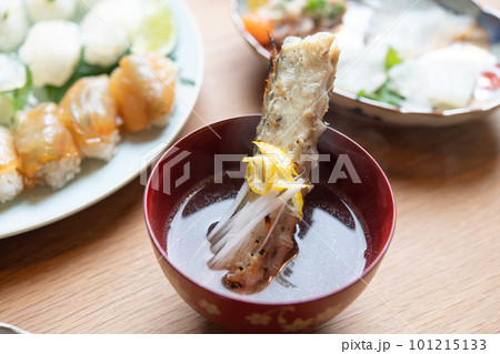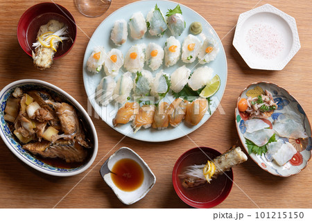 マゴチのお寿司、潮汁、お刺身、煮付け
