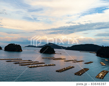 養殖いかだのある魚港の風景