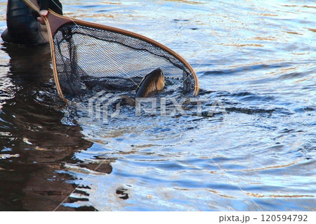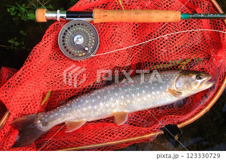 釣り ネットに横たわるアメマス 大きい 雨鱒