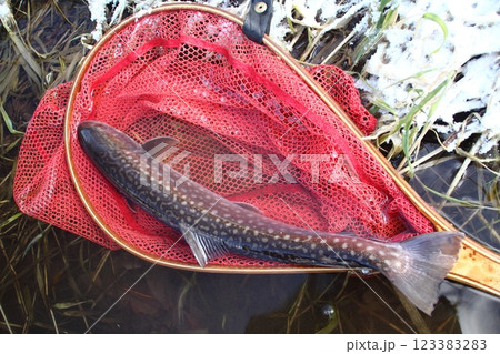 釣り ネットに横たわるアメマスの模様 大きい 雨鱒