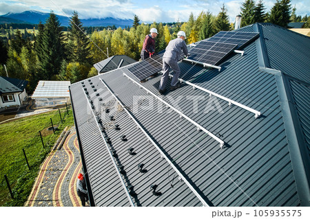 Technicians installing solar panel system on roof of house. Men workers in helmets carrying photovoltaic solar module outdoors. Concept of alternative and renewable energy.