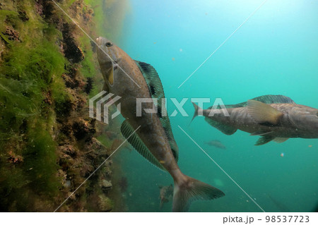 Salmon in the river, ready to swim against the current. Underwater photography.