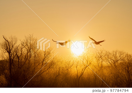 朝日を背景に飛び立つ2羽のタンチョウ