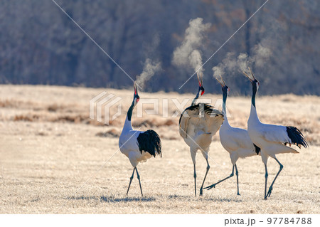 白い息を吐くタンチョウ4羽の鳴き合い