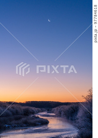 音羽橋から見る雪裡川の三日月とブルーモーメント、タンチョウ