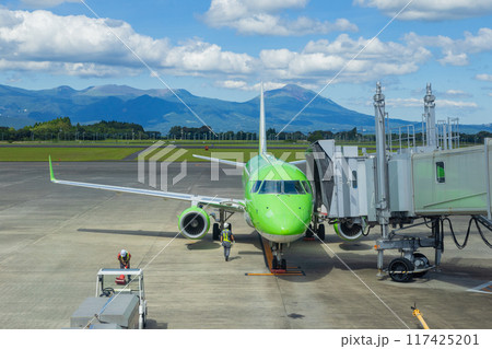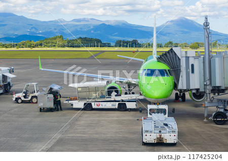 霧島山とFDAの出発準備風景 鹿児島空港