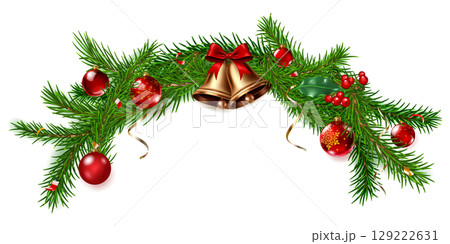 Festive Christmas garland made of pine branches, red ornaments and bells with bow.