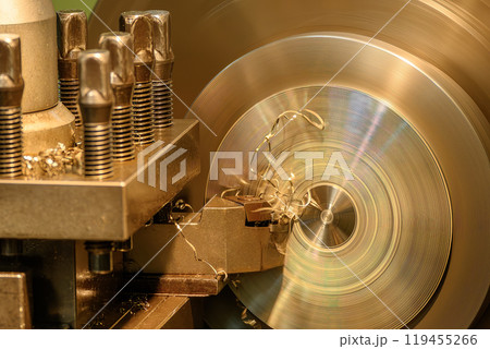 Closeup scene the lathe machine finish cut the metal parts by lathe tools.