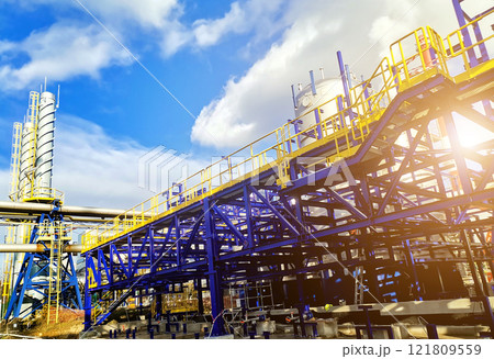 Steel structure is under construction on the construction site against a blue sky backdrop