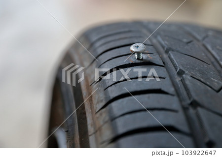 釘で穴が開いた自動車のタイヤ