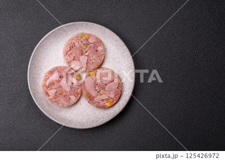 Homemade headcheese with salt, spices, herbs and vegetables