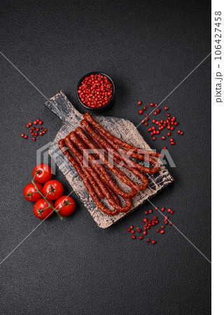 Delicious thin smoked hunting sausages with salt, spices and herbs