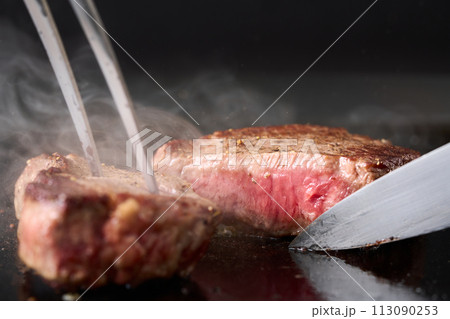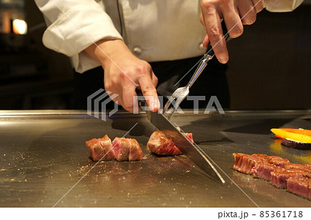 鉄板焼 鉄板焼き 切る カット 調理中 肉 和牛 01