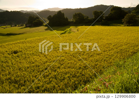 鉄穴残丘 夕陽に照らされた棚田 稲穂 黄金色 つなぐ棚田遺産比和三河内の棚田