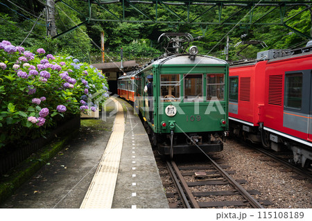箱根登山電車_満開の紫陽花とあじさい電車の風景