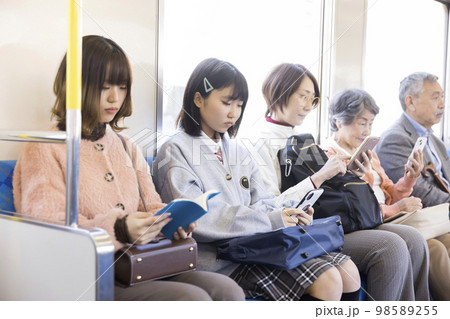 通勤電車の車内・女子高生・サラリーマン 撮影協力「京王電鉄株式会社