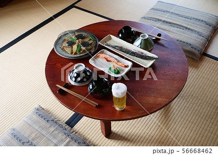 風景静物時代写真 丸いちゃぶ台で囲む夕餉 昭和の食卓