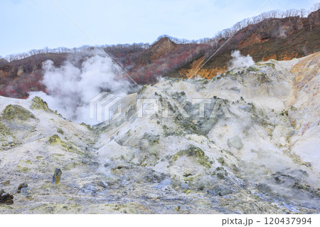 登別地獄谷から立ち上る噴煙と枯れ果てた山肌 北海道登別市