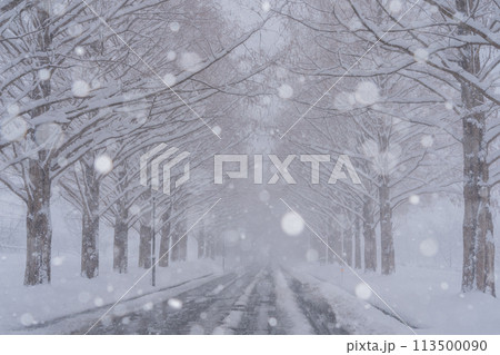 滋賀県高島市の雪冬の冬のメタセコイア並木を撮影したもの