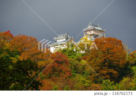 鉛色の空を背景に紅葉に染まる越前大野城の天守 Ver1