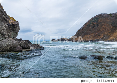 小浦海岸にそびえたつ断崖と渚の風景 青い空と水平線 (千葉県 御宿町)