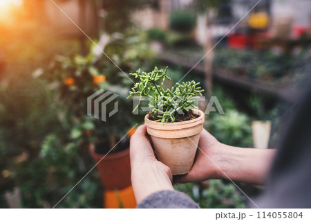Small greenhouse business. Gardener holding potted succulent.