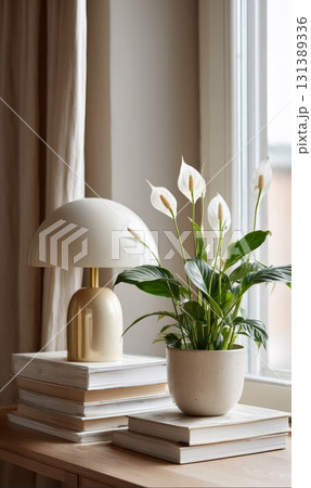 Elegant desk plant decor with white flowers and stylish lamp beside stacked books in cozy interior
