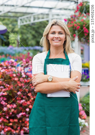 Mid adult woman in green apron tending plants in greenhouse and referencing notebook and pen