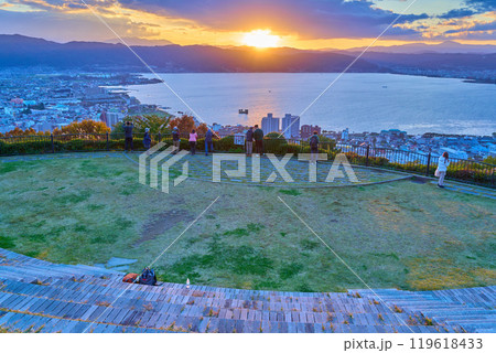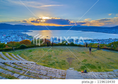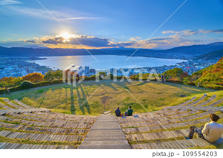 秋の長野県諏訪市の立石公園から夕日の眺望(諏訪湖方面)